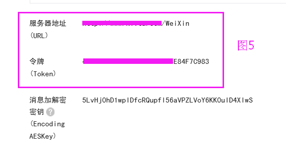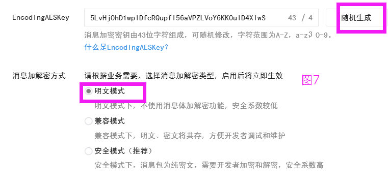 二:EncodingAESKey:点随机生成,消息加解密方式:明文模式,点提交(图6)。