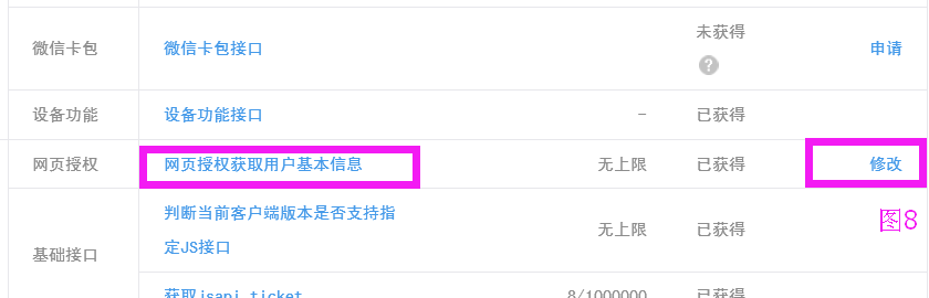 一:在微信公众号后台左侧菜单点开发---->点接口权限,右边内容里面找到网页授权,点修改(图8)