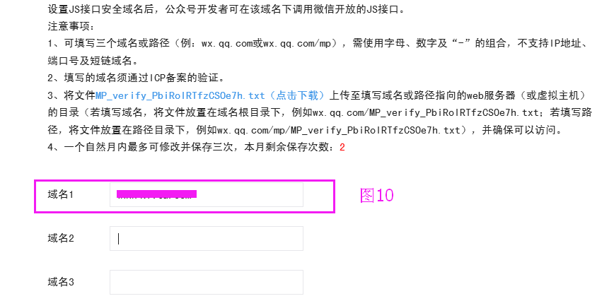 二:需要设置:业务域名,JS接口安全域名,网页授权域名(图9),