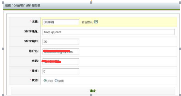 2、配置QQ邮箱账户密码到网站后台邮件服务器接口, 注意SMTP地址为:smtp.qq.com,账户为:XXXX@qq.com,密码为QQ邮箱密码,STMP端口是 25,设置好进行保存。