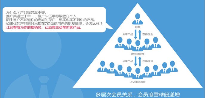 2、会员开通微店后推广对应生成的永久二维码,客户关注后即成为平台站微信的粉丝,并同时成为推广会员发展的下级会员,各下级会员消费或者推广成单后,按设置计算相关会员应得的推广佣金。
